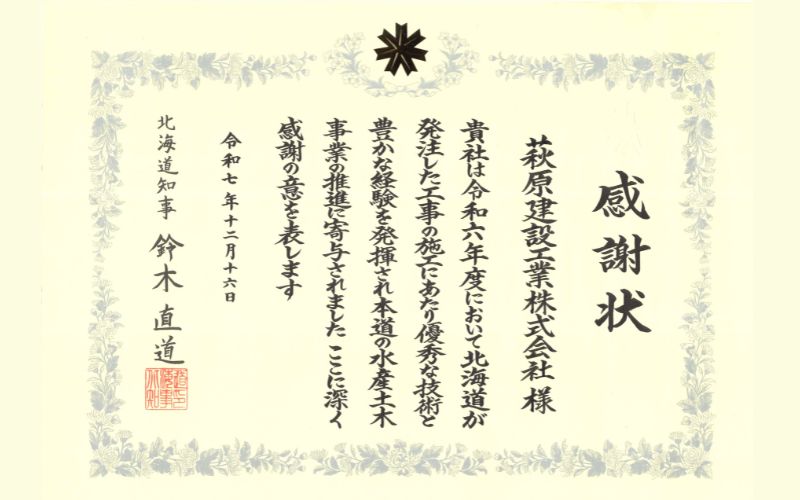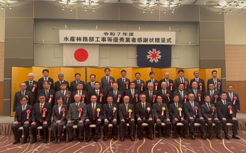 令和7年12月16日(火)、ホテル札幌ガーデンパレス(札幌市)にて、令和7年度 水産林務部工事等優秀業者知事感謝状贈呈式が執り行われ、当社は水産土木部門において表彰を拝受しました。