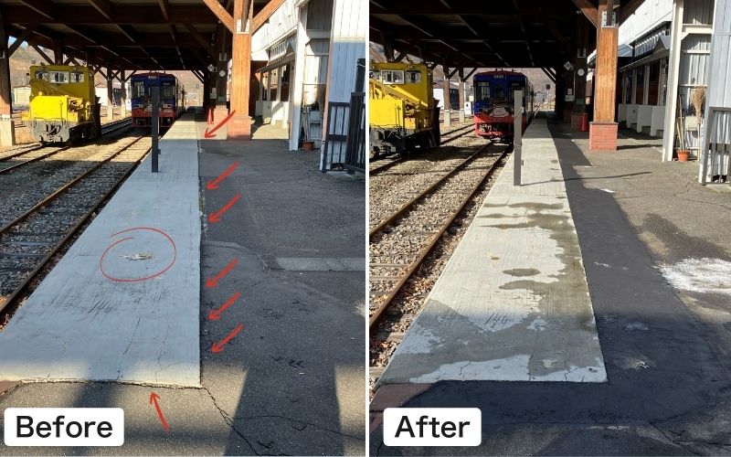~老朽化により、ホーム内で穴が開いていたところやガタガタしていた箇所に舗装する等の作業を行い、穴埋めや段差を平らにしました。