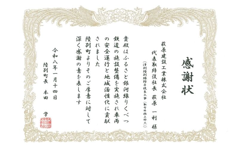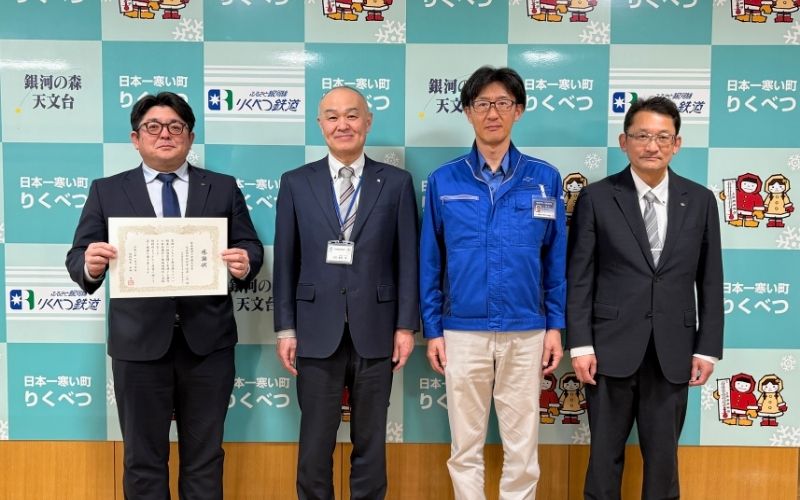 令和8年1月14日(水)、弊社が施工している「津別陸別線防B改良工事(取布牛橋上部工)」でお世話になっている陸別町で「ふるさと銀河線りくべつ鉄道の施設整備」を行い、車両の安全運行と地域活性化に貢献したとして、陸別町長 本田 学 様より感謝状が授与されました。