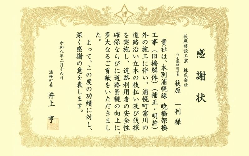令和8年2月16日(月)、弊社が施工している「本別浦幌線 暁橋架換工事(旧橋解体)(補正・明許)外」に伴い、浦幌町の道路沿いの樹木整備(枝払い・伐採)を行い、道路利用者の安全確保と景観向上に貢献したとして、感謝状を拝受しました。