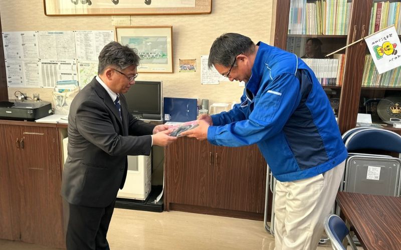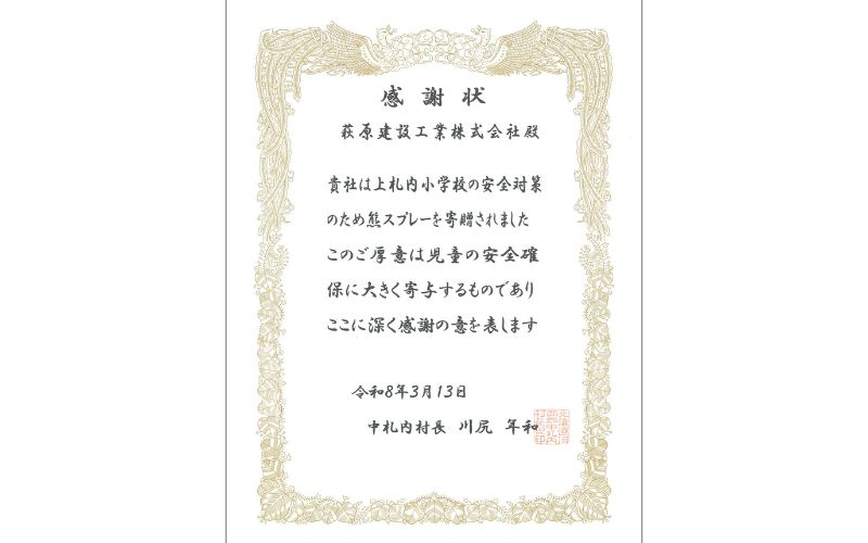 令和8年3月13日(金)、弊社が施工している「上札内帯広線 上札内橋架換工事(第1号橋)」でお世話になっている中札内村の小学校に「熊スプレー」を寄贈しました。これについて「児童の安全確保に大きく寄与した」として、中札内村長 川尻様より感謝状が授与されました。